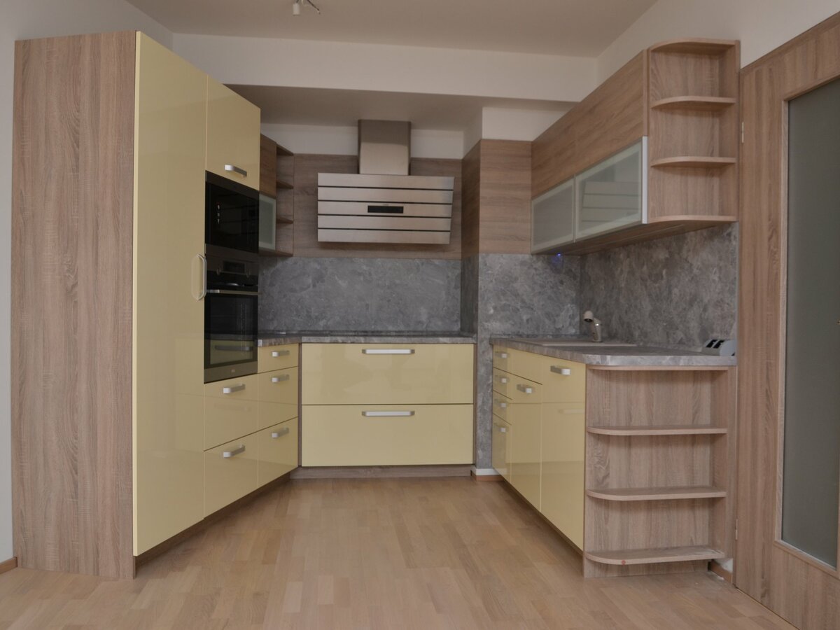 Kuchyně na zakázku vanilka lesk Praha 7 šikmý roh.jpg